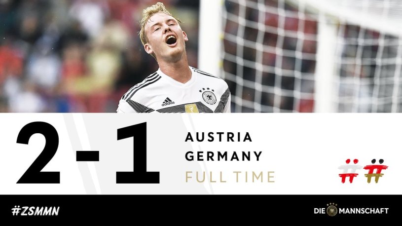 В приятелска среща, играна на „Вьортерзее щадион“ в Клагенфурт, Австрия, отборът на „Австрия“ постигна престижна победа с 2:1 над готвещия се за Световното първенство тим на „Германия“. Шампионът от Мондиал 2014 откри резултата още в 11-ата минута благодарение на Месут Йозил, но през второто полувреме домакините сътвориха пълен обрат, за който главна заслуга имаха Мартин Хинтерегер и Алесандро Шьопф, разписали се съответно в 53-ата и 69-ата минута.