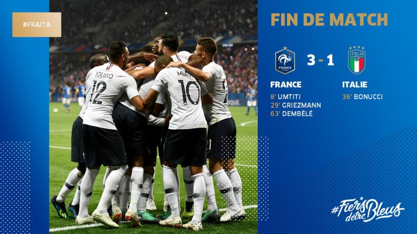 Отборът на „Франция“ постигна успех с 3:1 над тима на „Италия“ в приятелска среща, играна на стадион „Алианц Ривера“ в Ница. „Петлите“ откираха резултата още в 8-ата минута благодарение на Самюел Юмтити, а в 29-ата Антоан Гризман удвои преднината на домакините след точно изпълнена дузпа. В 36-ата минута последва отговорът на италианците, които съумяха да се върнат обратно в играта чрез попадение на Леонардо Бонучи, но финалната дума в двубоя все пак имаше „Франция“, и по-точно Усман Дембеле, който в 68-ата минута реализира красиво попадение, с което прекърши амбициите на италианците и оформи крайното 3:1 в полза на „петлите“.