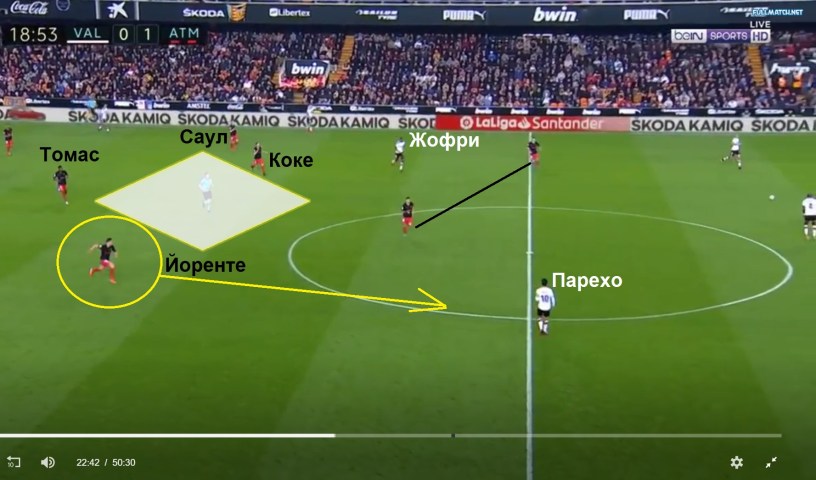 На изображението виждаме точно това, а именно – компактно подреден тим на „Атлетико“ (Мадрид), чиято халфова линия е преградила пътя на Парехо и Кондогбия, по който те да движат топката напред и тя да достига до играчите, внедрили се между линиите. В резултат на това, Жофри Кондогбия опитва да изнесе топката с дълго подаване към намиращия се на фланга Фреан Торес, но подаването на французина се оказва неточно и пресечено от Саул Нигес.