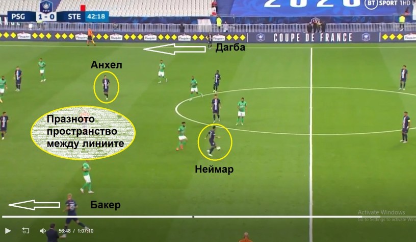 Заслуга за реализацията на тези движения от страна на Неймар и Ди Мария имаха и двамата дефанзивни полузащитници на столичани – Леандро Паредес и Идриса Гей – които заедно се връщаха назад, по-близо до двамата централни бранители – Кимпембе и Тиаго Силва – за да издърпват със себе си и двамата централни полузащитници на „Сент-Етиен“, което спомагаше за отваряне на това пространство между линиите на „зелените“, което Неймар и Анхел ди Мария имаха за цел да оползотворят.