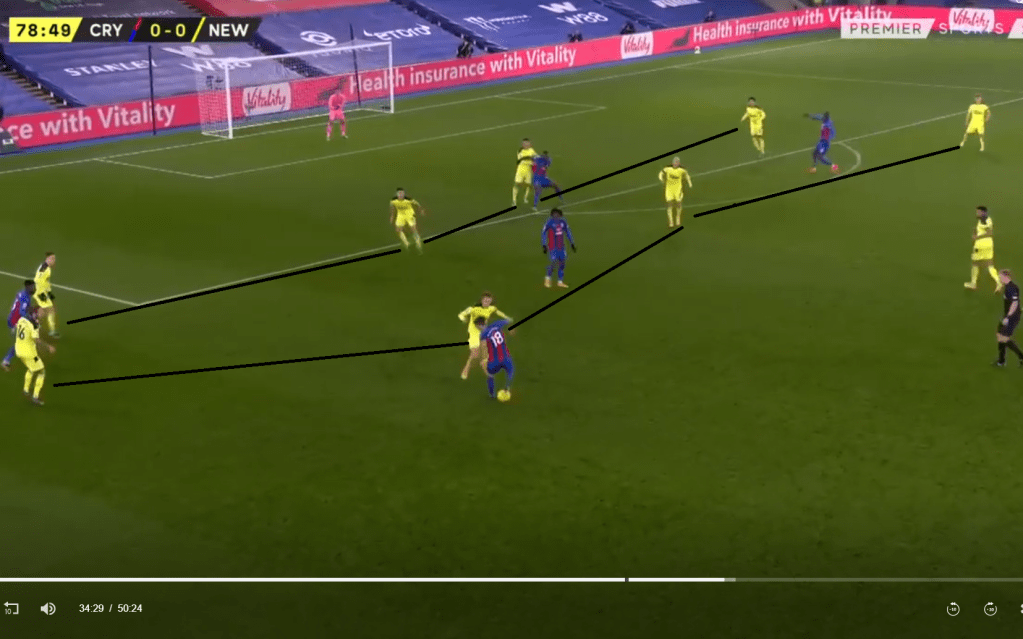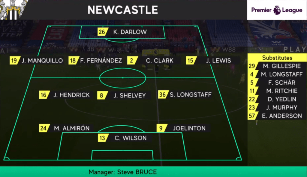 В предни позиции оставаха Джефри Шлуп и Джордан Аю, които по време на атакувщи действия от страна на „Кристъл Палас“ в половината на „Нюкасъл“ биваха подпомагани от активните включвания на Таузънд и Езе.