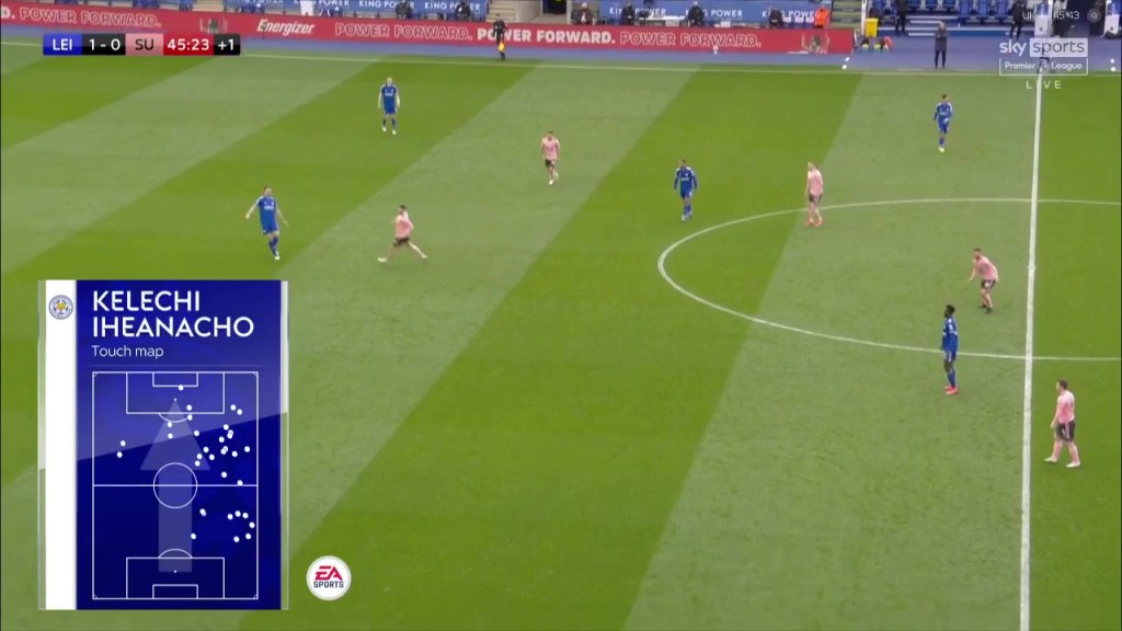 В моментите, когато Келеши Ихеаначо пък не се дърпаше назад, а оставаше вклинен между защитниците на „Шефилд Юнайтед“, Джейми Варди се дърпаше с една идея по-вляво към фланга, където да получава топката и да осигурява прострелни центрирания към позициониралия се в наказателното поле нигериец. По този начин се случиха два от общо трите гола на Ихеаначо в тази среща.