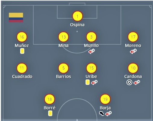 Непосредствено преди сигнала за край на първата част се наложи извършването на принудителна смяна в редиците на „Колумбия“. Левият бек на мексиканския „Пачука“ Яиро Морено получи контузия и бе заменен от Уилям Тесийо, който застана на овакантената позиция, въпреки че по презумпция е централен бранител.