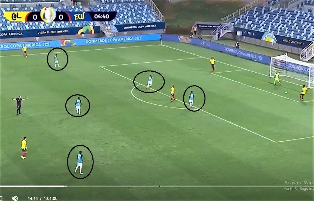 В 59-ата минута Фидел Мартинес от състава на „Ла Три“ отстъпи мястото си на Анхел Меня, който, въпреки че номинално е дясно крило, застана отляво, на позицията на Фидел Мартинес. Постройката 4-4-2 за „Еквадор“ се запази. Няколко минути по-късно обаче бяха регистрирани и смени в редиците на колумбийците. Централният нападател Мигел Борха и полузащитникът на „Порто“ Матеус Урибе отстъпиха своите места съответно на Дуван Запата и Себастиан Перес. И тук промени в тактическата постройка не последваха.