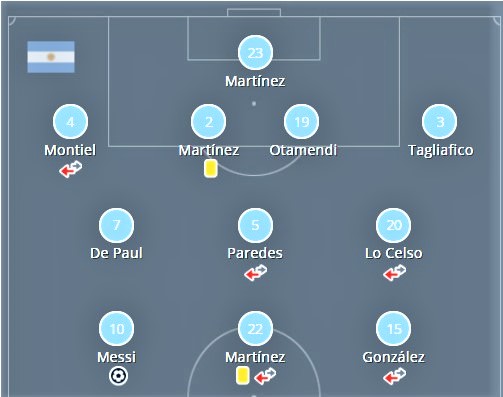 В 68-ата минута започнаха и смените в мача. Първи към тях пристъпи Лионел Скалони. Джовани Ло Селсо и Леандро Паредес отстъпиха своите места съответно на Анхел ди Мария и Езикиел Паласиос. От тези промени последва и връщането на Меси в халфовата линия, а първоначалната му позиция на дясното крило бе заета от Анхел ди Мария. Така в полузащитата на „Аржентина“ действаха Родриго Де Пол, Езикиел Паласиос и Лионел Меси, а в нападение – Николас Гонсалес, Лаутаро Мартинес и Анхел ди Мария.