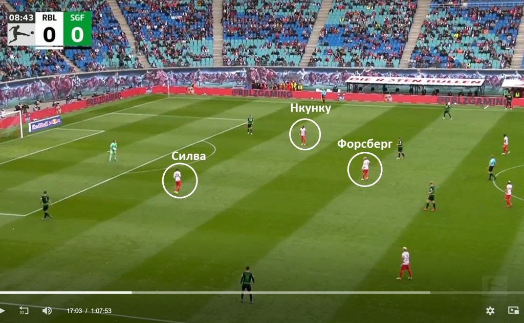 Кристофър Нкунки действаше като пълноправен партньор на Андре Силва на върха на атаката, а Емил Форсберг пък оперираше зад тях, но това бе едно от най-очакваните неща на света. Липсваше влизането в комбинации от страна на Кристофър Нконку с неговите съотборници – един от най-отличителните белези в играта на французина срещу сгъстена отбрана – но главната заслуга за това се имаше ефективната игра в защита на „Гройтер Фюрт“, която правеше много трудно разиграването за „Лайпциг“.