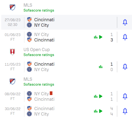 „Ню Йорк Сити“ изпитва трудности през този сезон в МЛС. Отборът от Голямата ябълка няма победа в последните си 4 мача в лигата. Както споменах по-горе, за последно двата тима се изправиха един срещу друг на 1 юни в среща от редовния сезон, като в нея краен победител се оказа „Синсинати“, а след въпросния двубой най-често срещаният резултат за „Ню Йорк Сити“ в рамките на МЛС бе равенството – 7 равенства, 1 победа и 2 загуби.