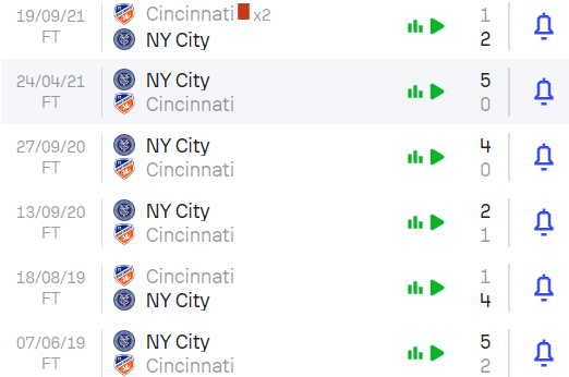 „Оранжево-сините“ са непобедени в последните си 4 мача във всички състезания срещу „Ню Йорк Сити“, като са записали 2 победи и 2 равенства. Въпросните два успеха бяха постигнати през този сезон – единият бе в турнира US Open Cup, а другият – в първенството. Те са и единствените към момента в историята на „Синсинати“ срещу „Ню Йорк Сити“.
